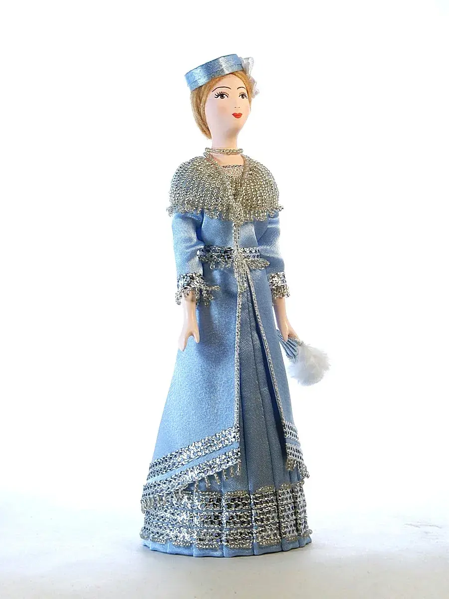 Изысканное воплощение эпохи — коллекционная кукла, запечатлевшая образ петербургской аристократки начала XX века. Созданная мастерами «Потешного промысла», эта статуэтка переносит нас в атмосферу блестящих балов и светских раутов Северной столицы.