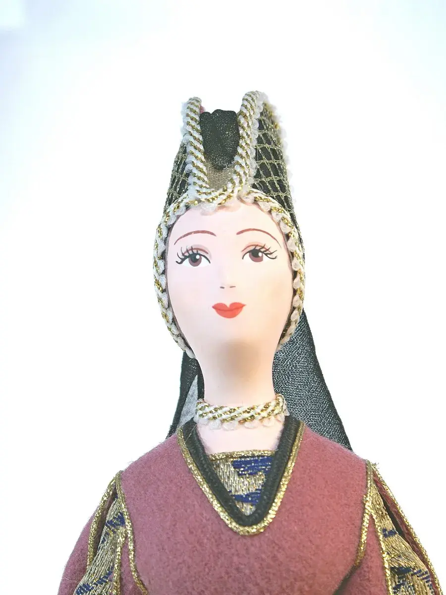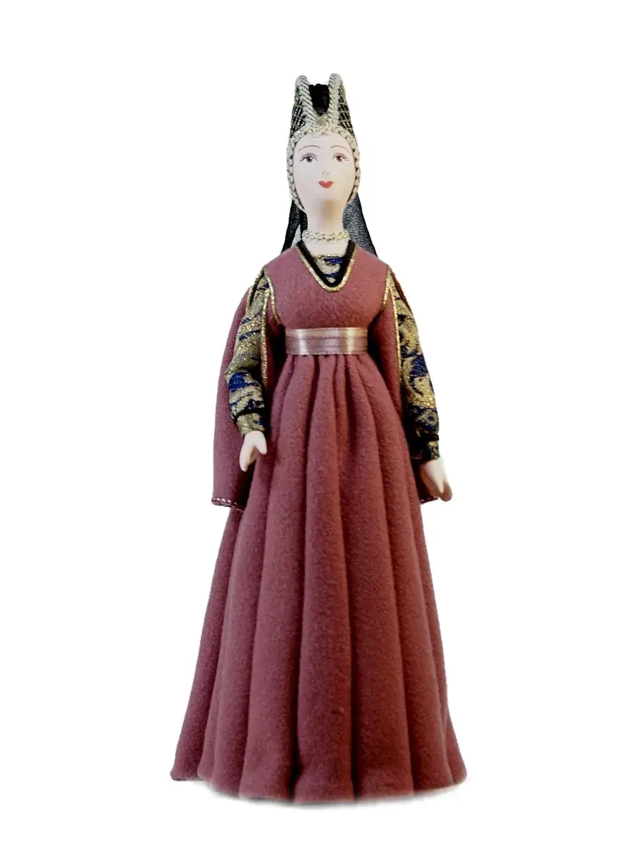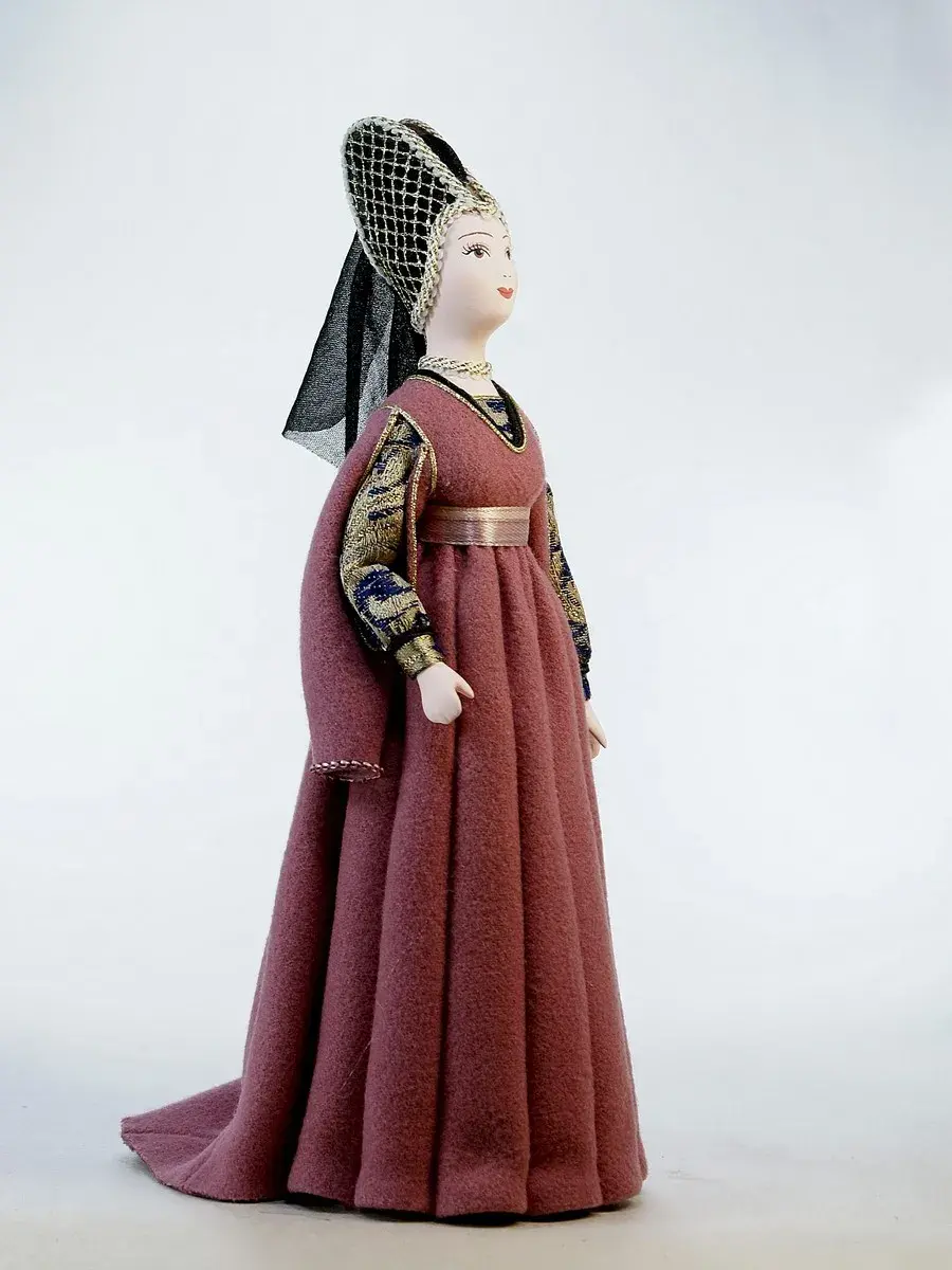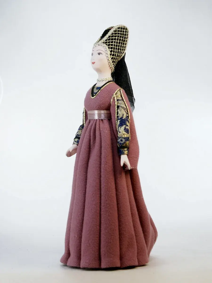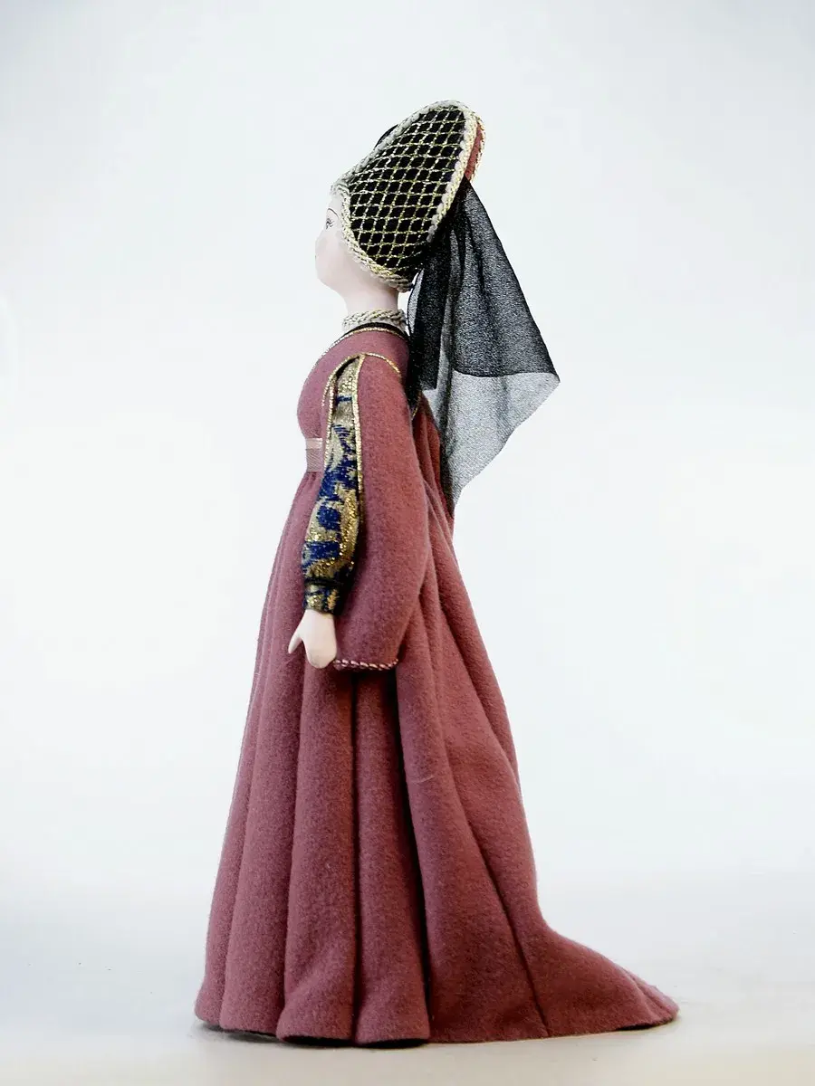 Голова и руки из бисквитного фарфора, отлиты и обожжены в собственной керамической мастерской при температуре +1200 градусов Цельсия. Расписаны вручную темперными красками. В основании конус из папье-маше (картон, ПВА, хлопчатобумажная ткань). Костюм несъемный текстильный.