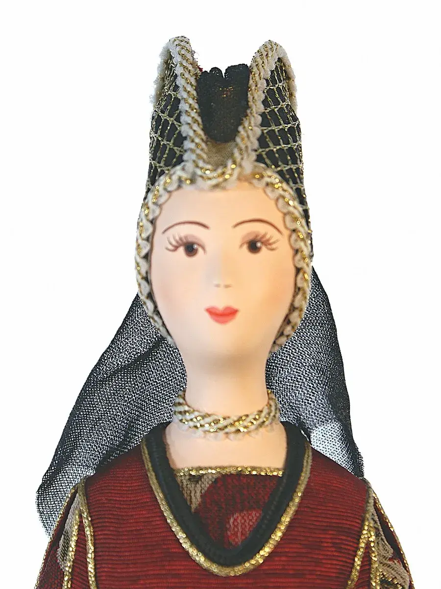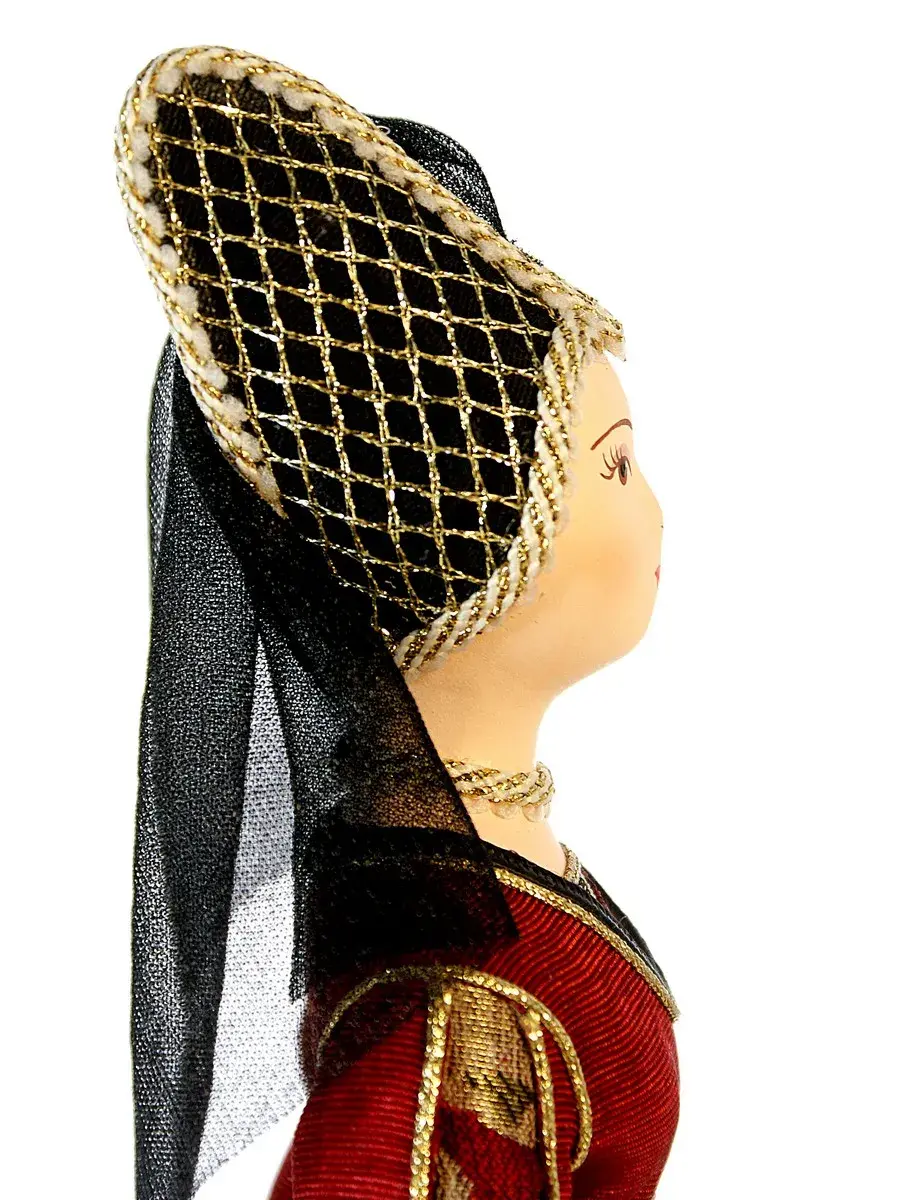 Голова и руки из бисквитного фарфора, отлиты и обожжены в собственной керамической мастерской при температуре +1200 градусов Цельсия. Расписаны вручную темперными красками. В основании конус из папье-маше (картон, ПВА, хлопчатобумажная ткань). Костюм несъемный текстильный.