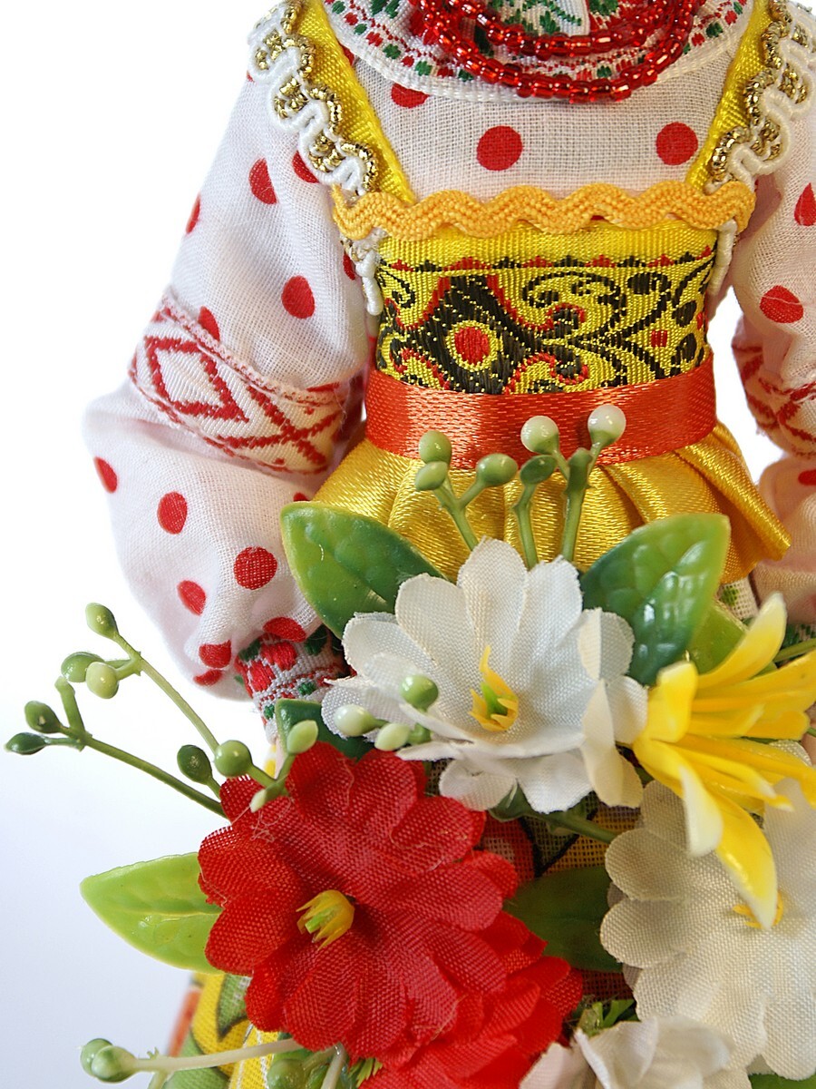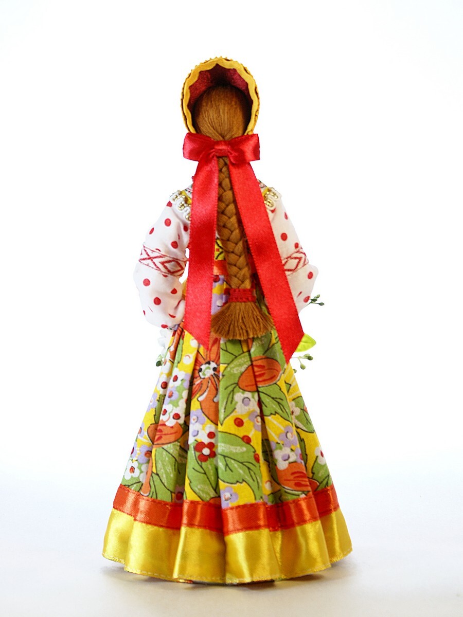 Высота около 25 см, костюм текстильный (тесьма, кружево) несъемный, в основании — конус из плотного картона, обтянутый тканью, ног у данной модели не предусмотрено.