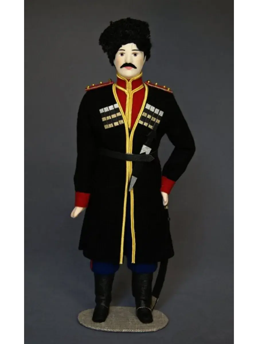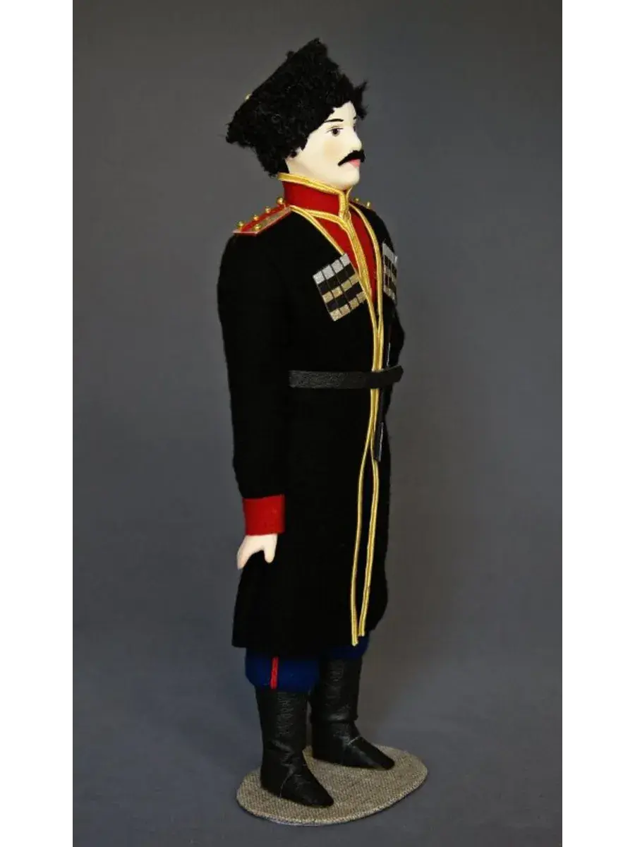 Высота около 26 см, костюм текстильный (атлас, тесьма) несъемный, в основании - конус из плотного картона, обтянутый тканью, ног у данной модели не предусмотрено.