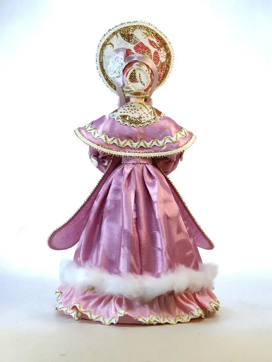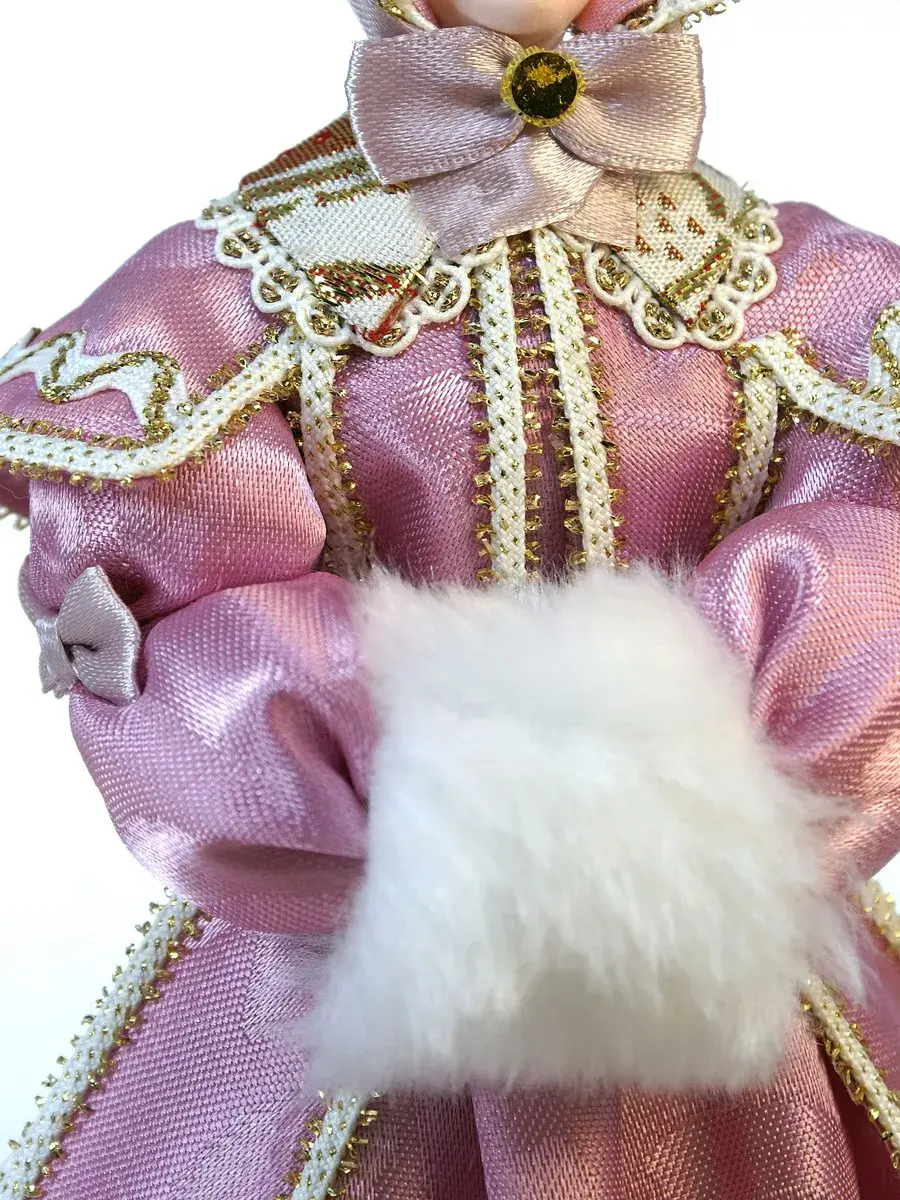 Голова и руки из бисквитного фарфора, отлиты и обожжены в собственной керамической мастерской при температуре +1200 градусов Цельсия. Расписаны вручную темперными красками. Костюм несъемный текстильный: жаккардовая ткань, креп-сатин, кружево, атласные ленты, искусственный мех, тесьма. В основании картонный конус, обтянутый хлопчатобумажной тканью.