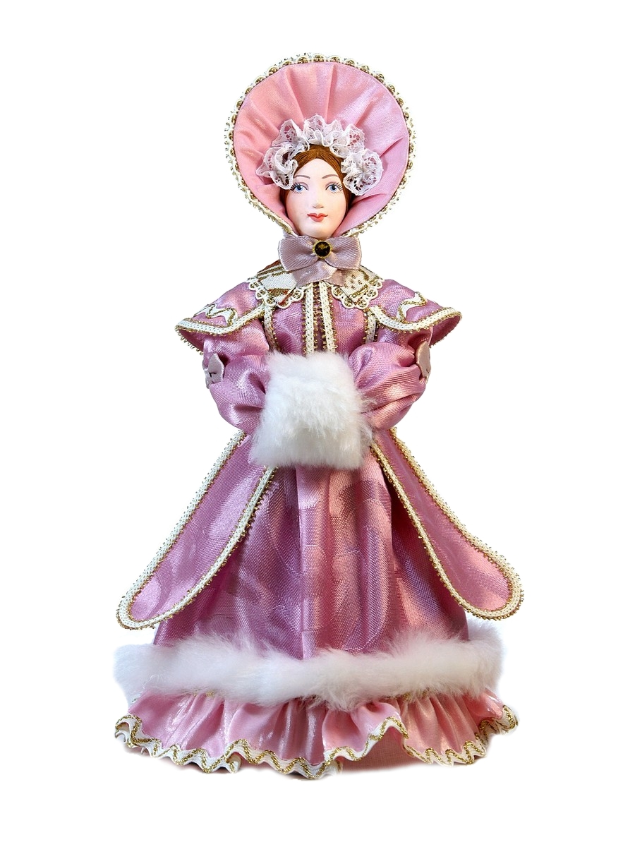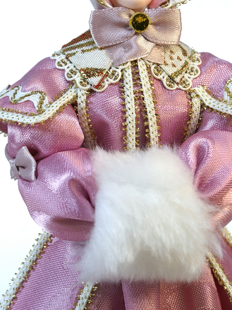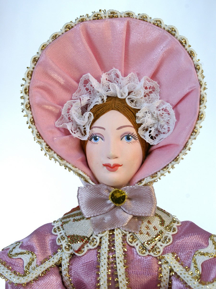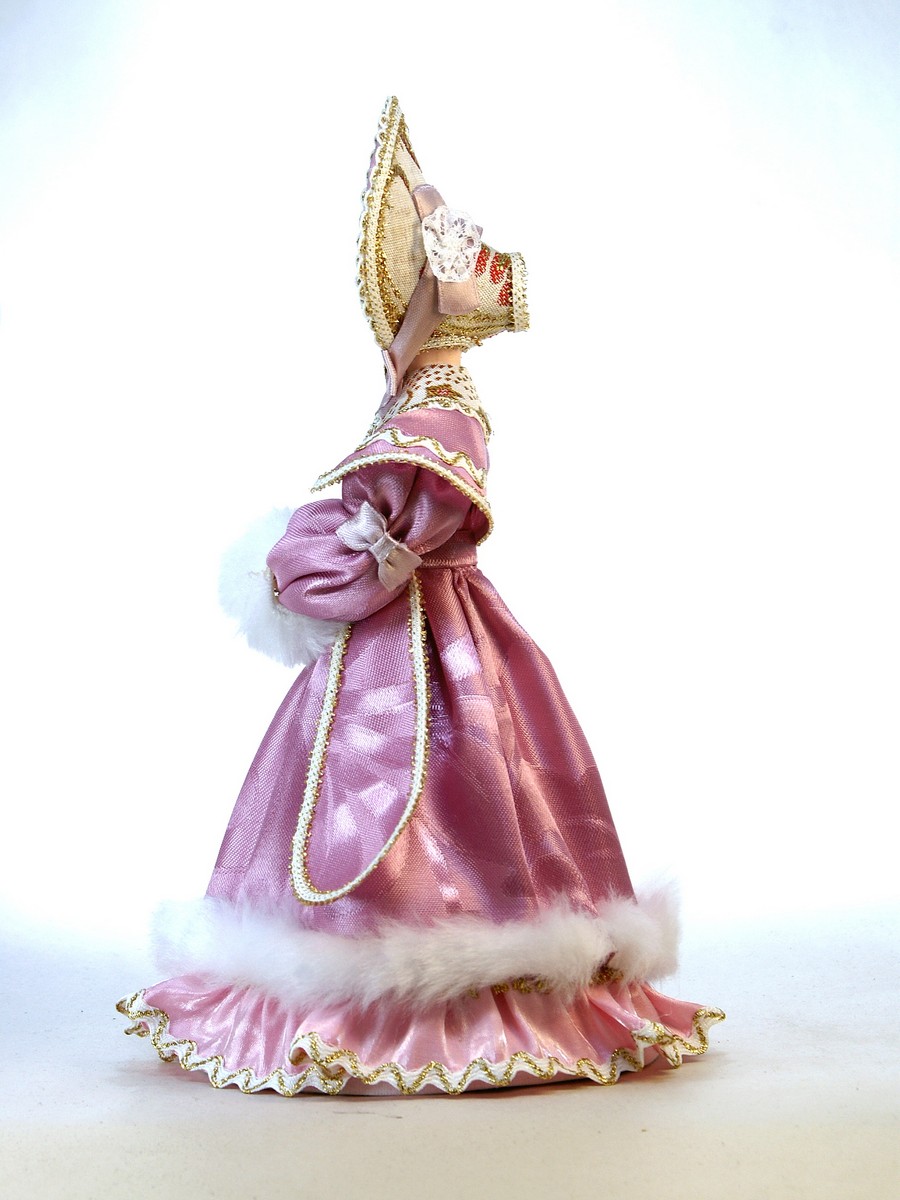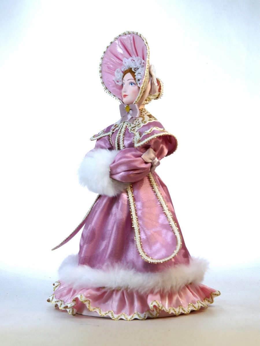 Интерьерная кукла ручной работы из коллекции Светский исторический костюм. Для подарка, для интерьера, в коллекцию.\n\nМатериал фарфор, текстиль. Высота 26 см. Артикул 0164