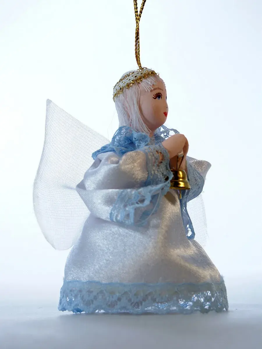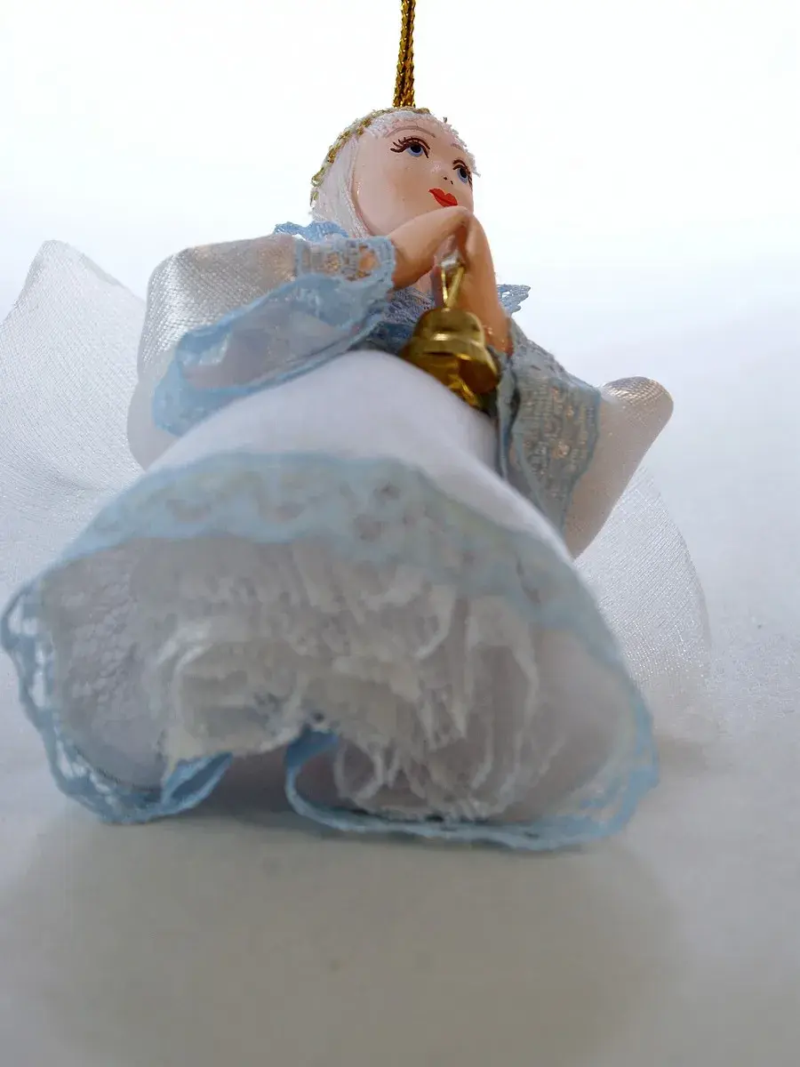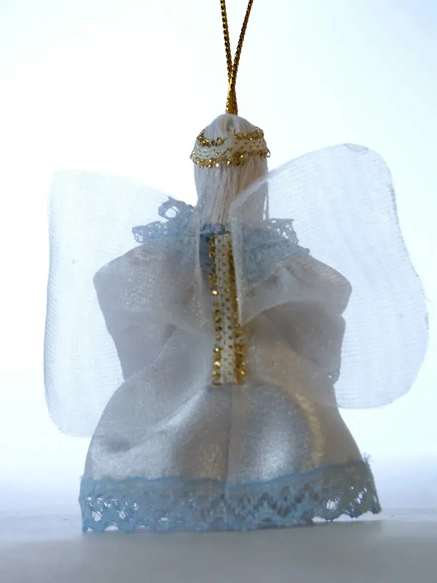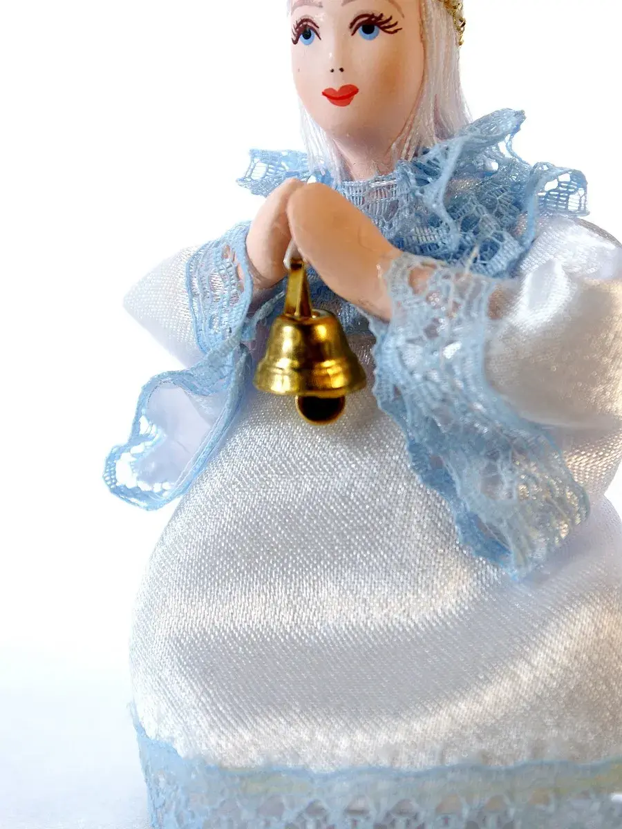 Кукла подвеска Потешного промысла «Летящий ангелочек с трубой». Материал фарфор, текстиль. Высота 10 см.