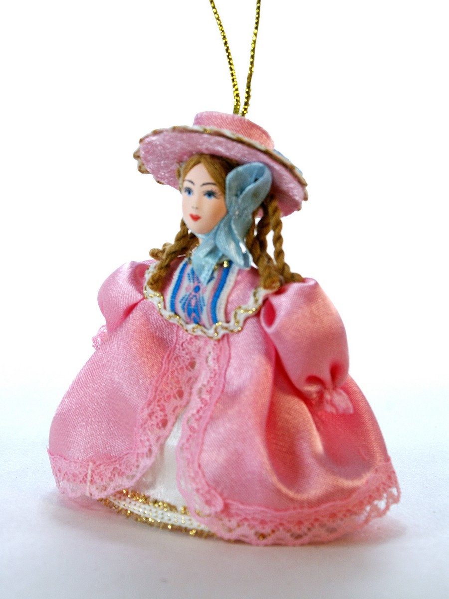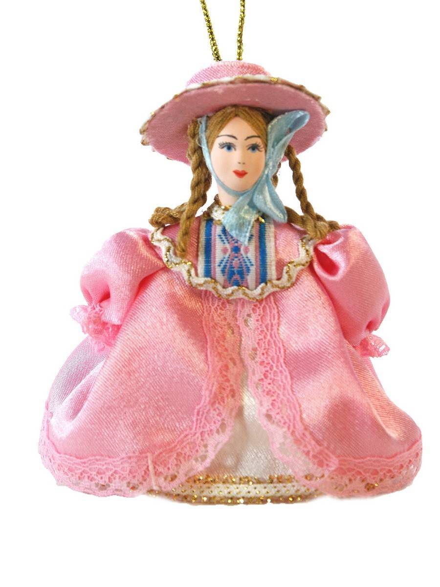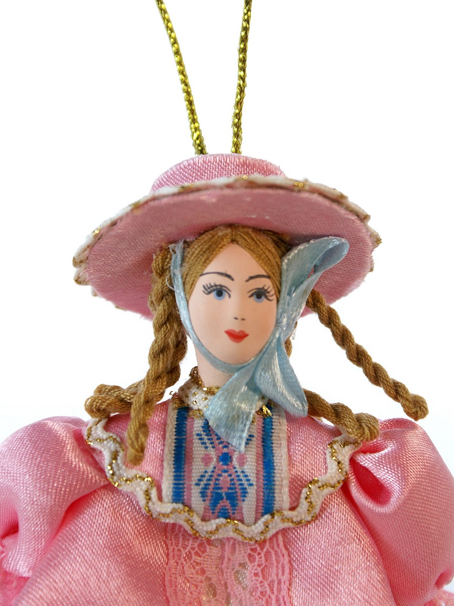 Кукла-подвеска сувенирная Потешного промысла Барышня в шляпке 19 века. Материал фарфор, текстиль. Высота 12 см. Артикул 0228.