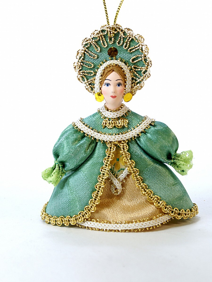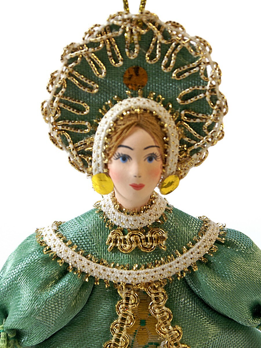 Кукла-подвеска Потешного промысла девушка в фигурном кокошнике. Русский костюм. Материал фарфор, текстиль. Высота 13 см. Артикул 0976-z.