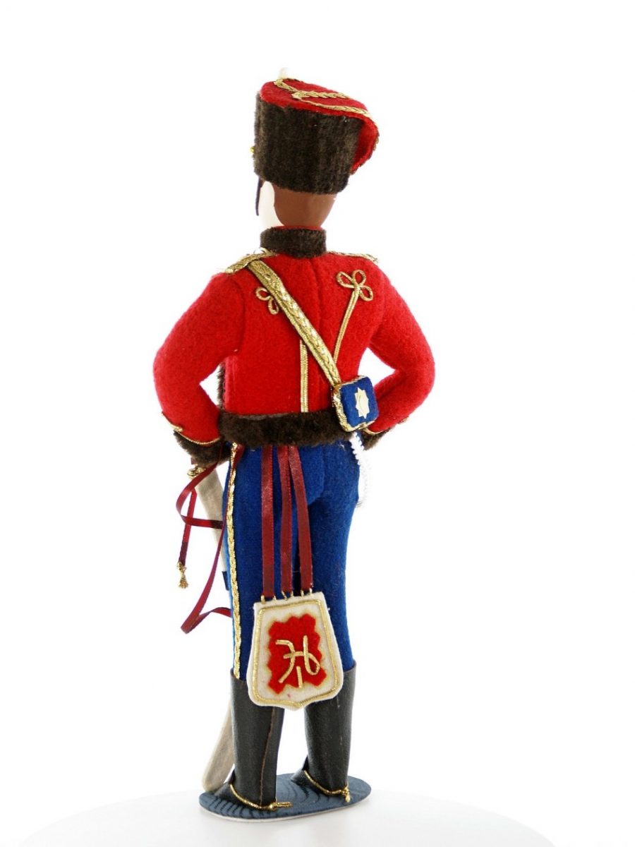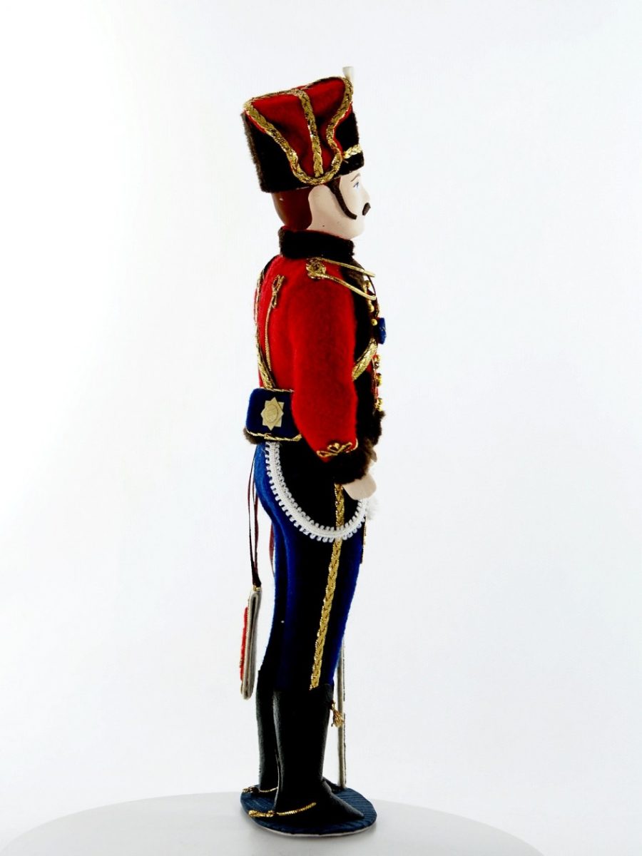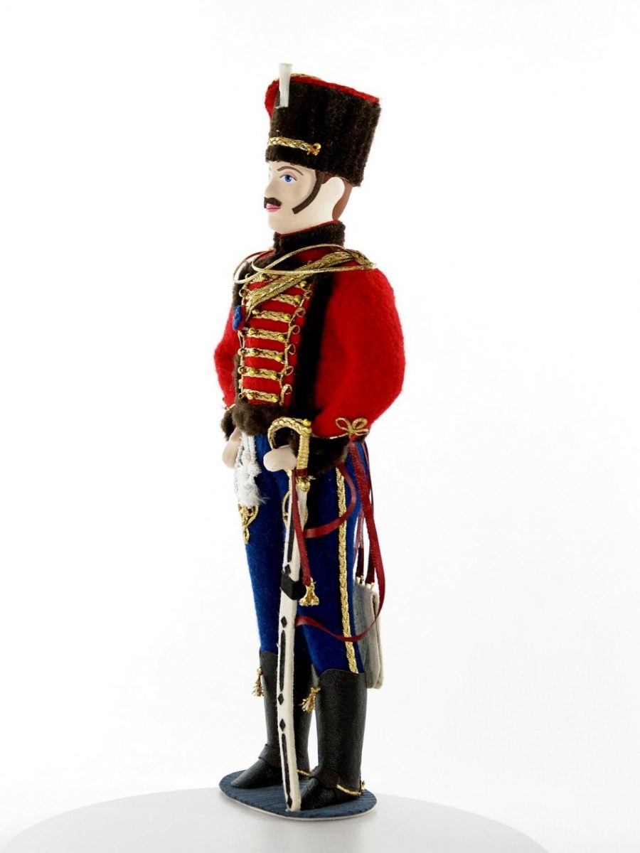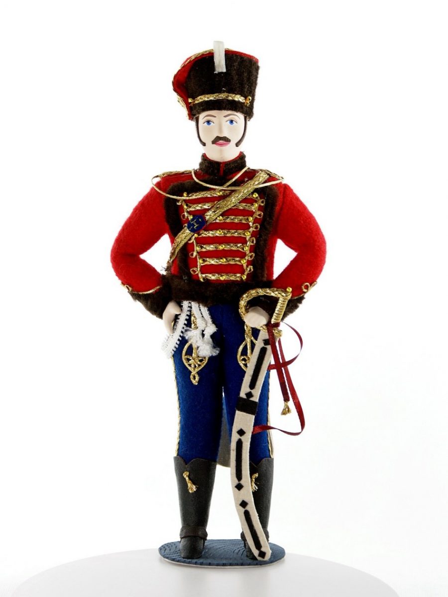 Мундир лейб-гвардии гусарского полка. 1849 г.\n\nИнтерьерная кукла ручной работы из коллекции Военный мундир России. Для подарка, для интерьера, в коллекцию. Фарфор, текстиль. Высота 27 см.\n\n
