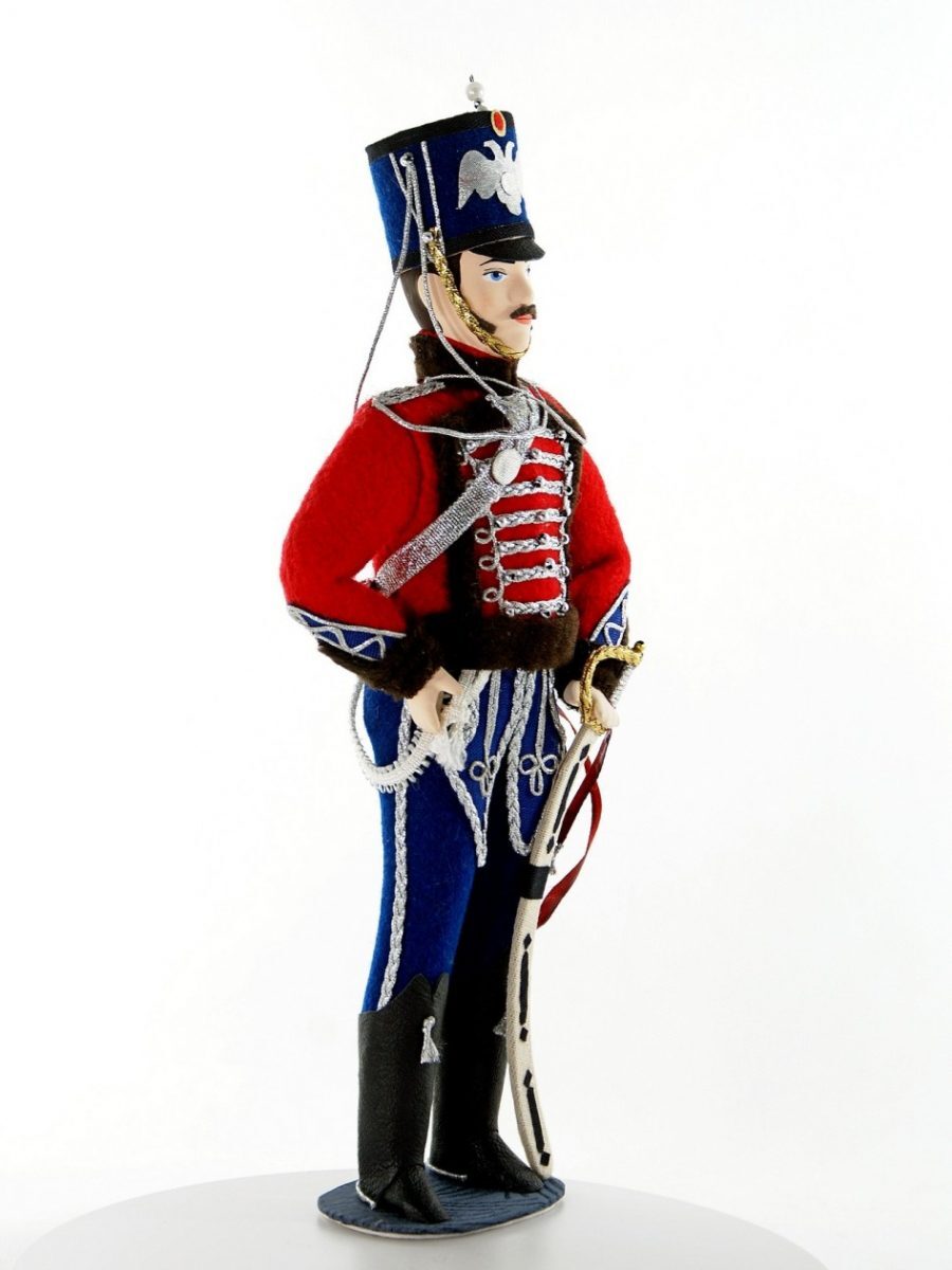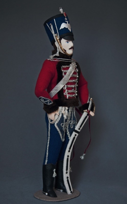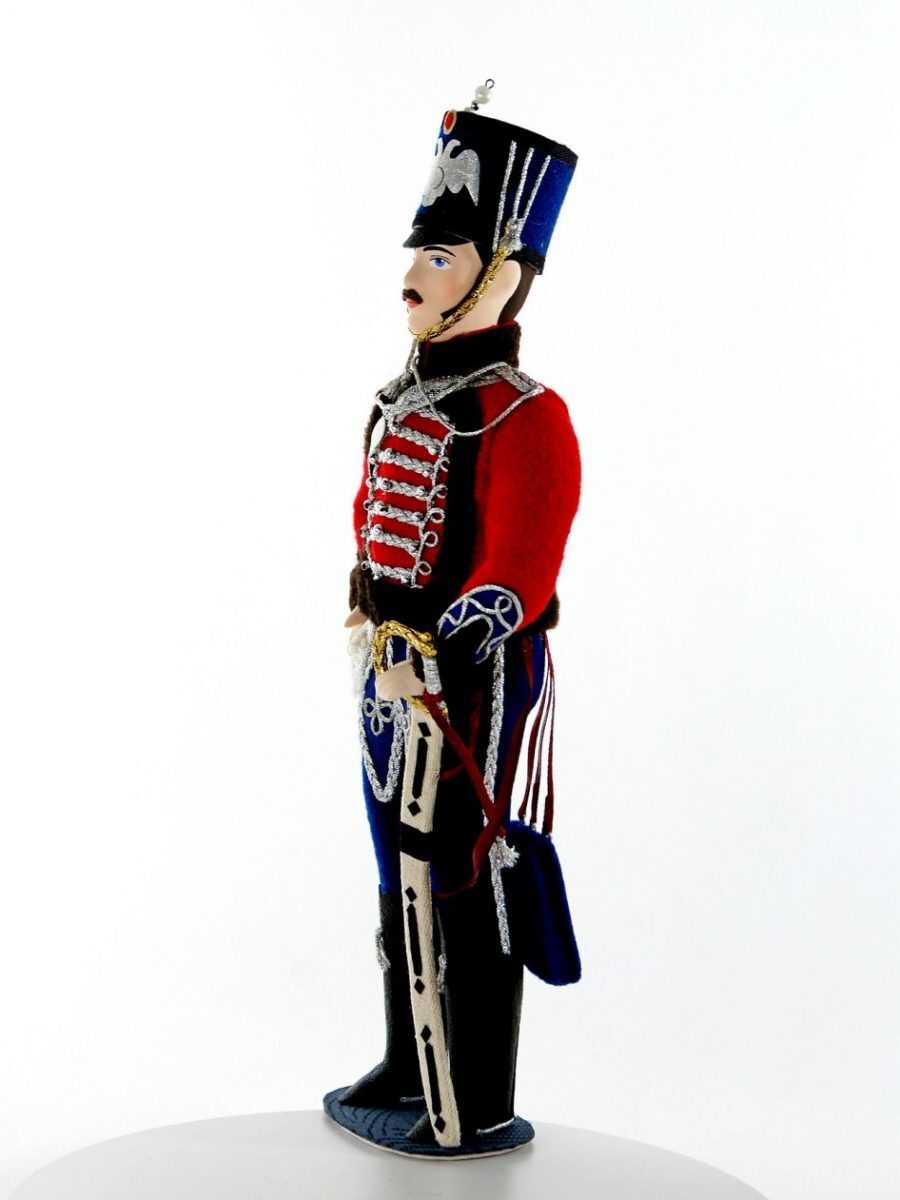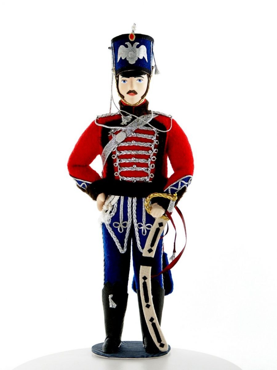 Интерьерная кукла ручной работы из коллекции Военный мундир России. Мундир лейб-гвардии гусарского полка. 1840-е г.\n\nДля подарка, для интерьера, в коллекцию. Фарфор, текстиль. Высота 27 см.