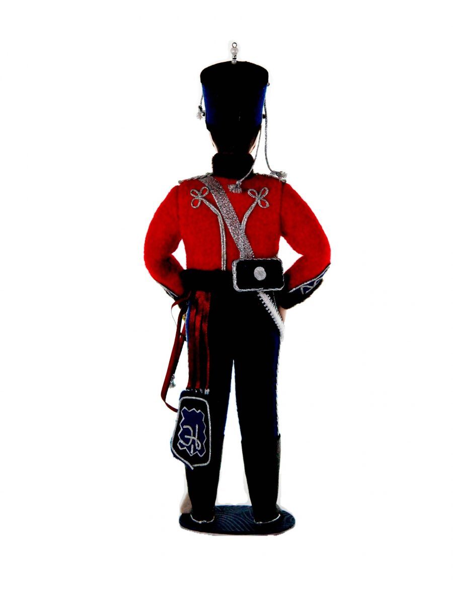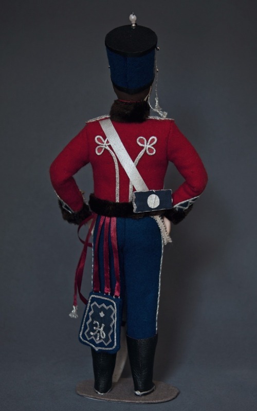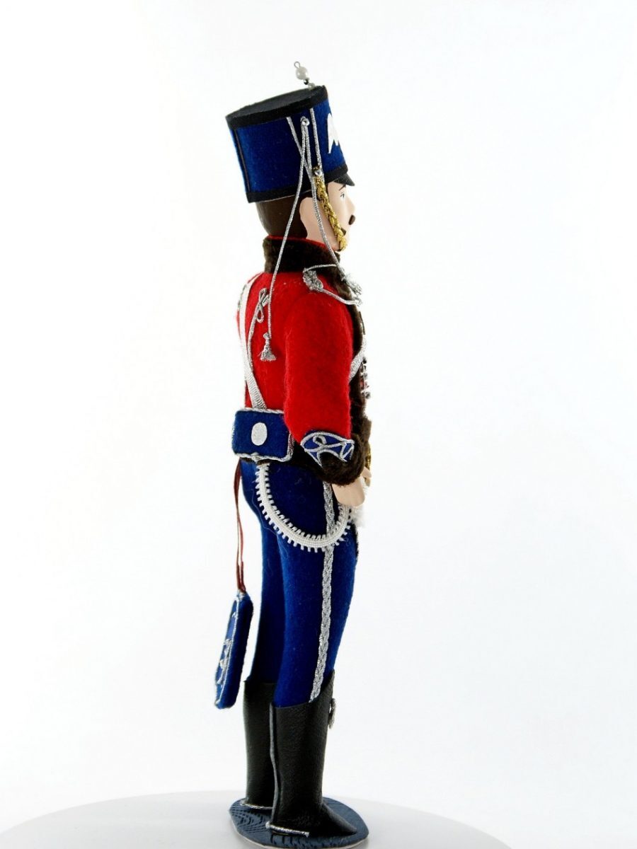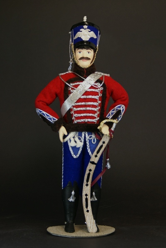 Интерьерная кукла ручной работы из коллекции Военный мундир России. Мундир лейб-гвардии гусарского полка. 1840-е г.\n\nДля подарка, для интерьера, в коллекцию. Фарфор, текстиль. Высота 27 см.
