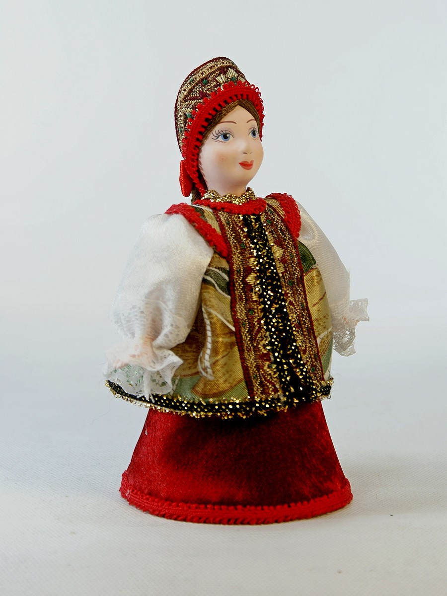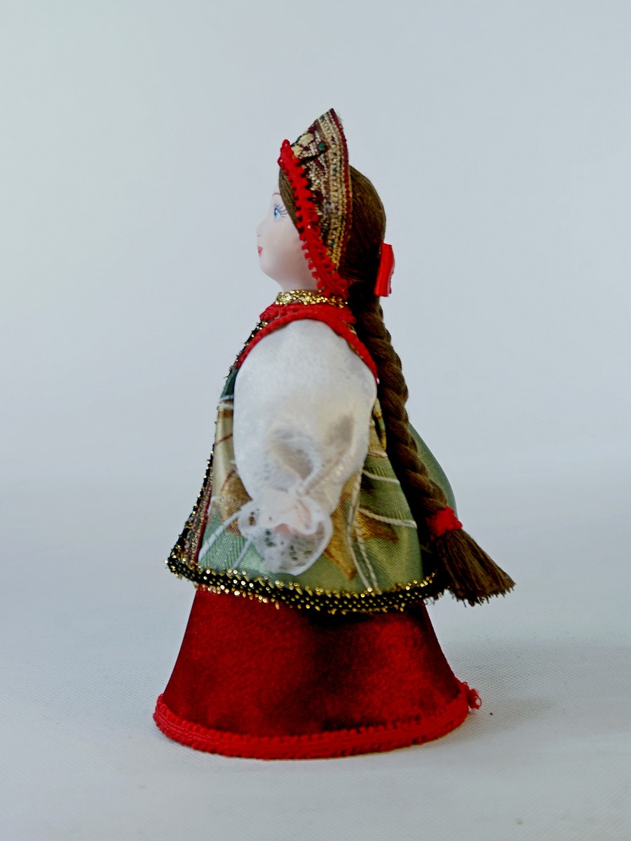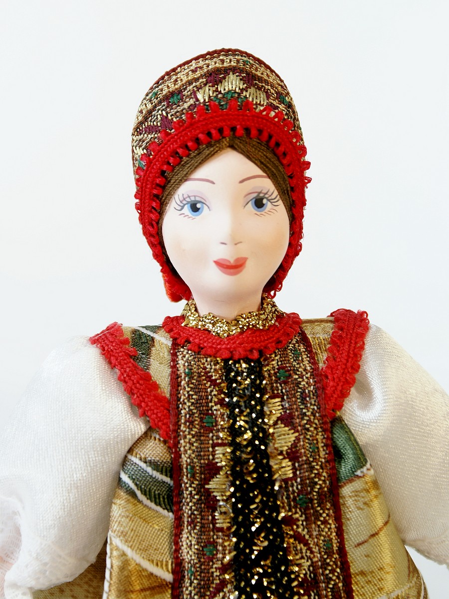 Кукла Потешного промысла девушка в русском народном костюме. Материал фарфор, текстиль. Высота 16 см. Артикул 0763.