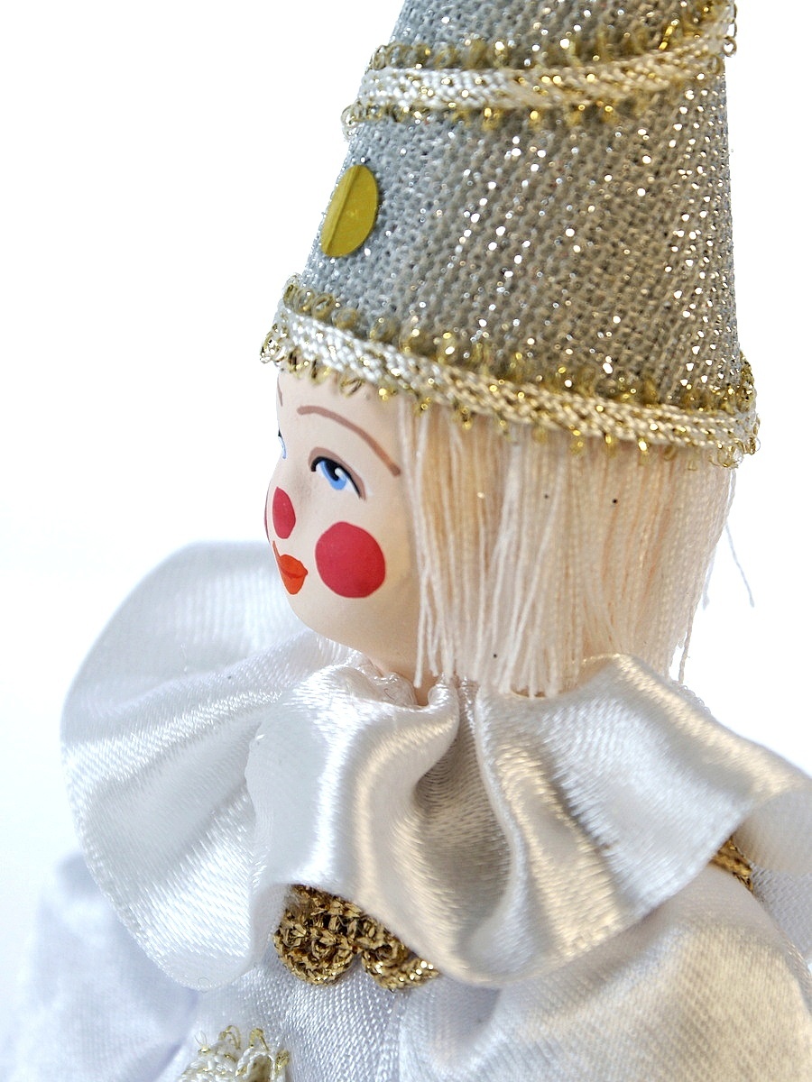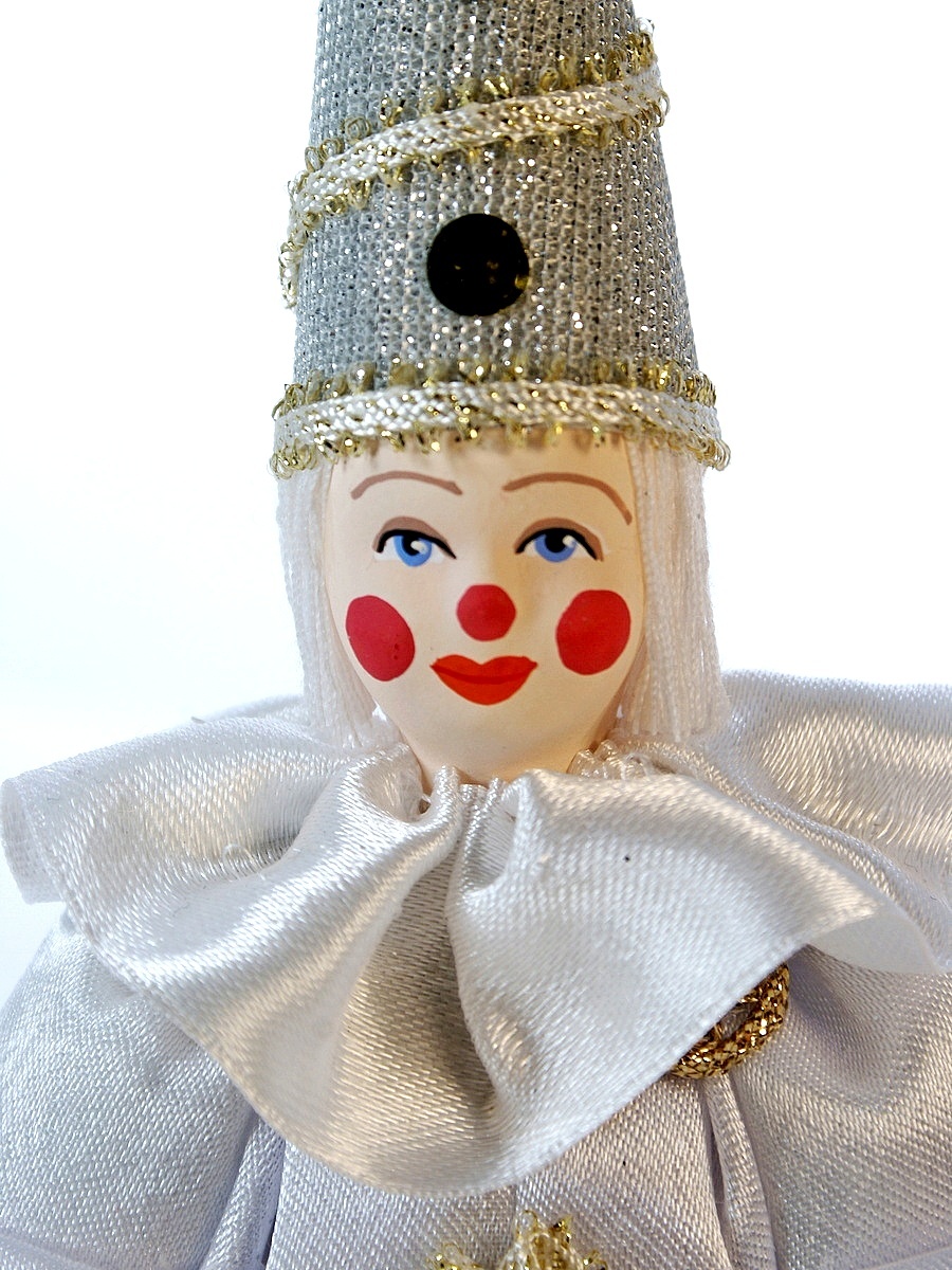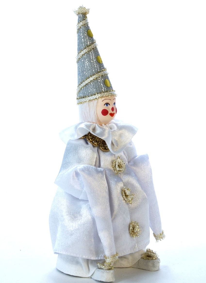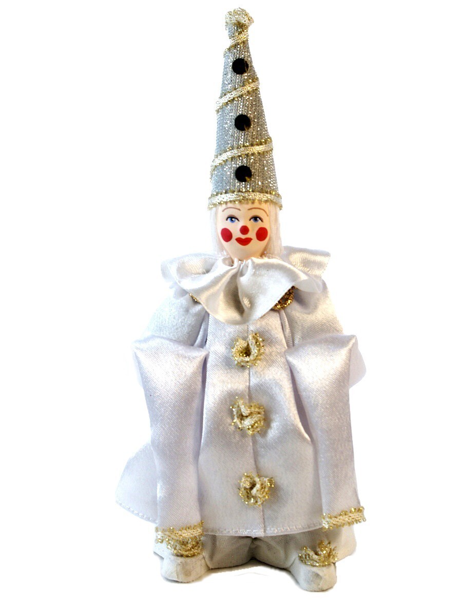 Кукла Потешного промысла ручной работы Пьеро, статичная статуэтка.. Материал фарфор, текстиль. Высота 20 см. Артикул 0375.