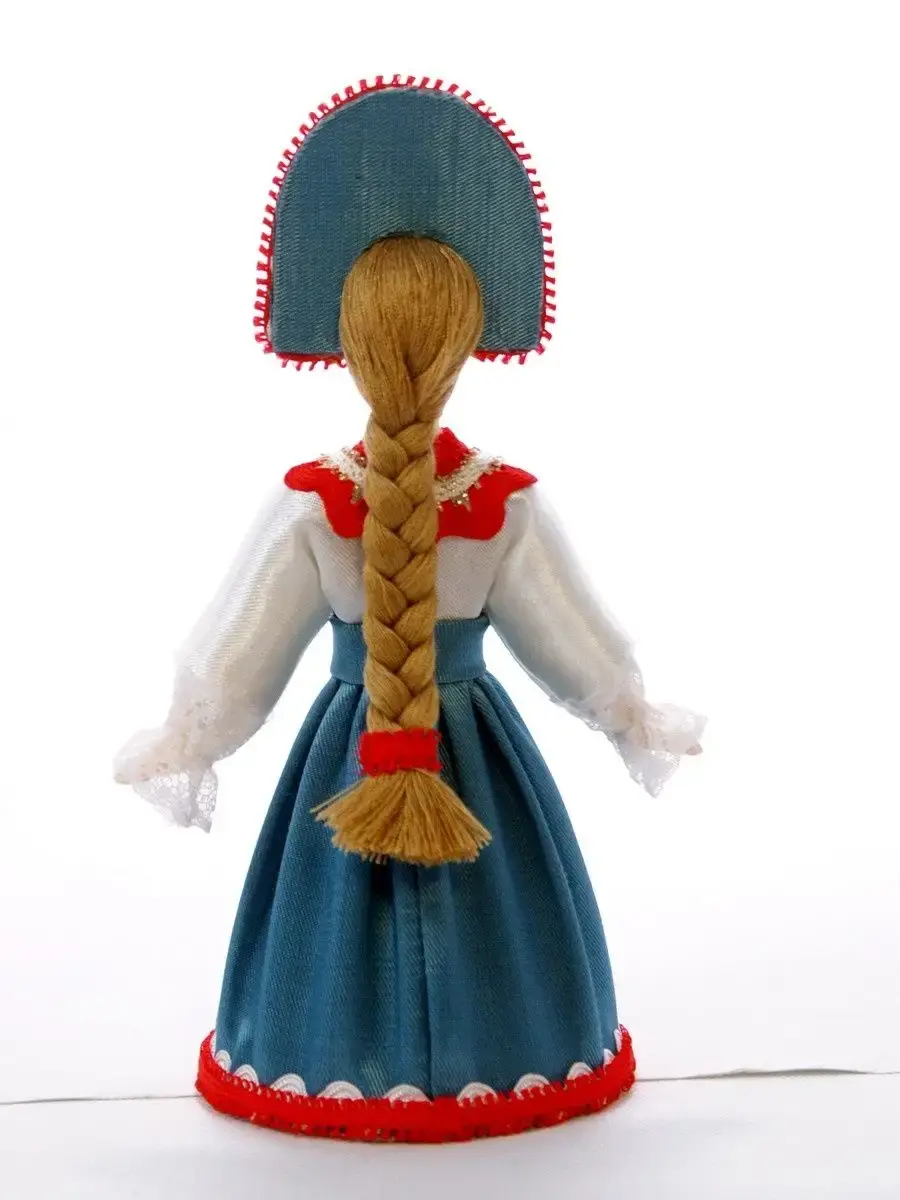 Высота около 17 см, костюм текстильный (ситец, атлас, тесьма) несъемный, в основании - конус из плотного картона, шириной около 8 см, обтянутый тканью, ног у данной модели не предусмотрено. Поставляется в крафтовой транспортировочной коробке с фирменным логотипом, зип-пакете и пузырчатой плёнке.