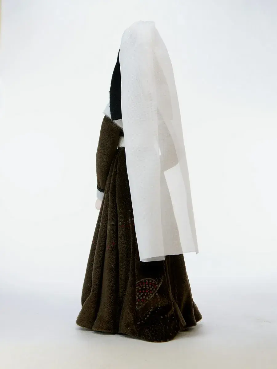 Голова и руки из бисквитного фарфора, отлиты и обожжены в собственной керамической мастерской при температуре +1200 градусов Цельсия. Расписаны вручную темперными красками. В основании конус из папье-маше (картон, ПВА, хлопчатобумажная ткань). Костюм несъемный текстильный.
