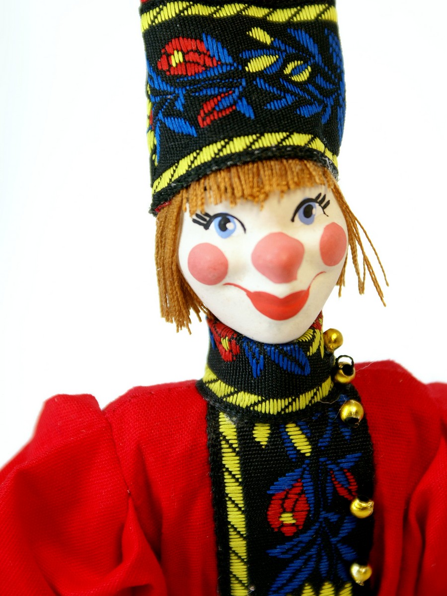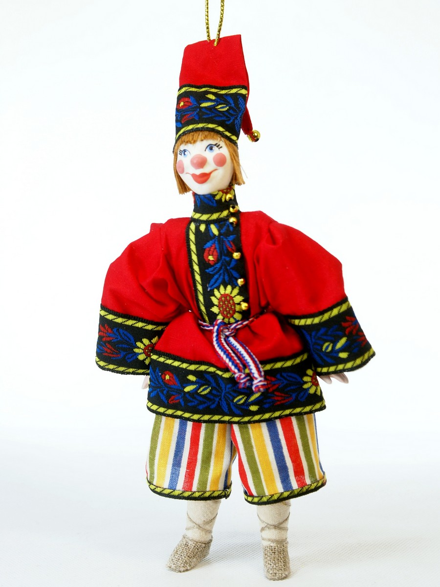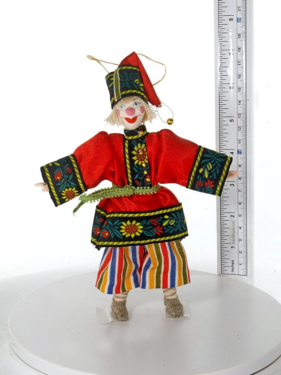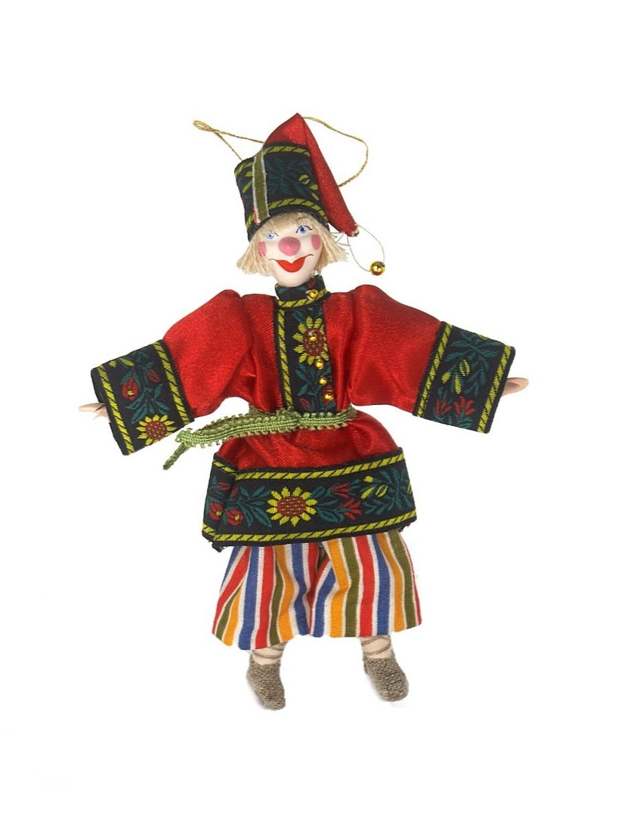 Персонаж народного театра. Россия.\n\nКукла интерьерная ручной работы из коллекции Подвески. Для подарка, для интерьера, в коллекцию. Фарфор, текстиль. Высота 19 см.