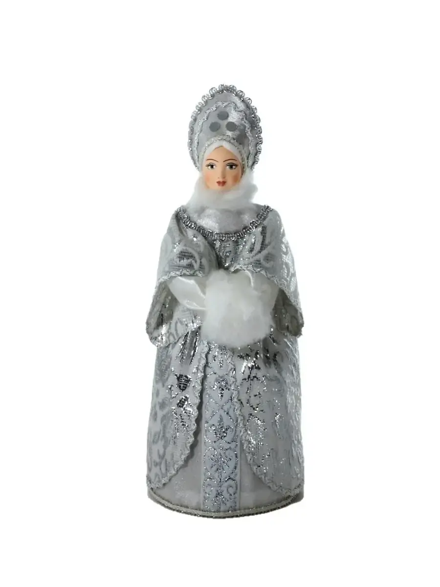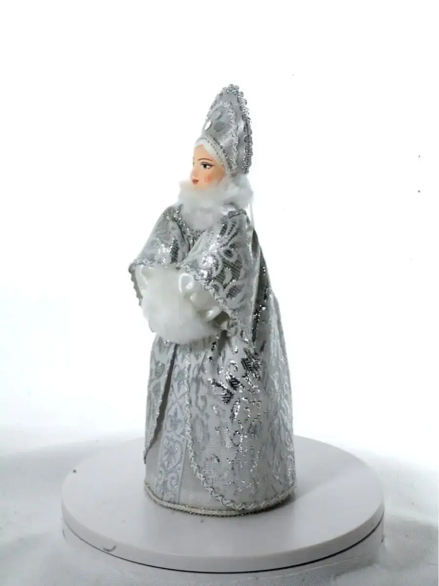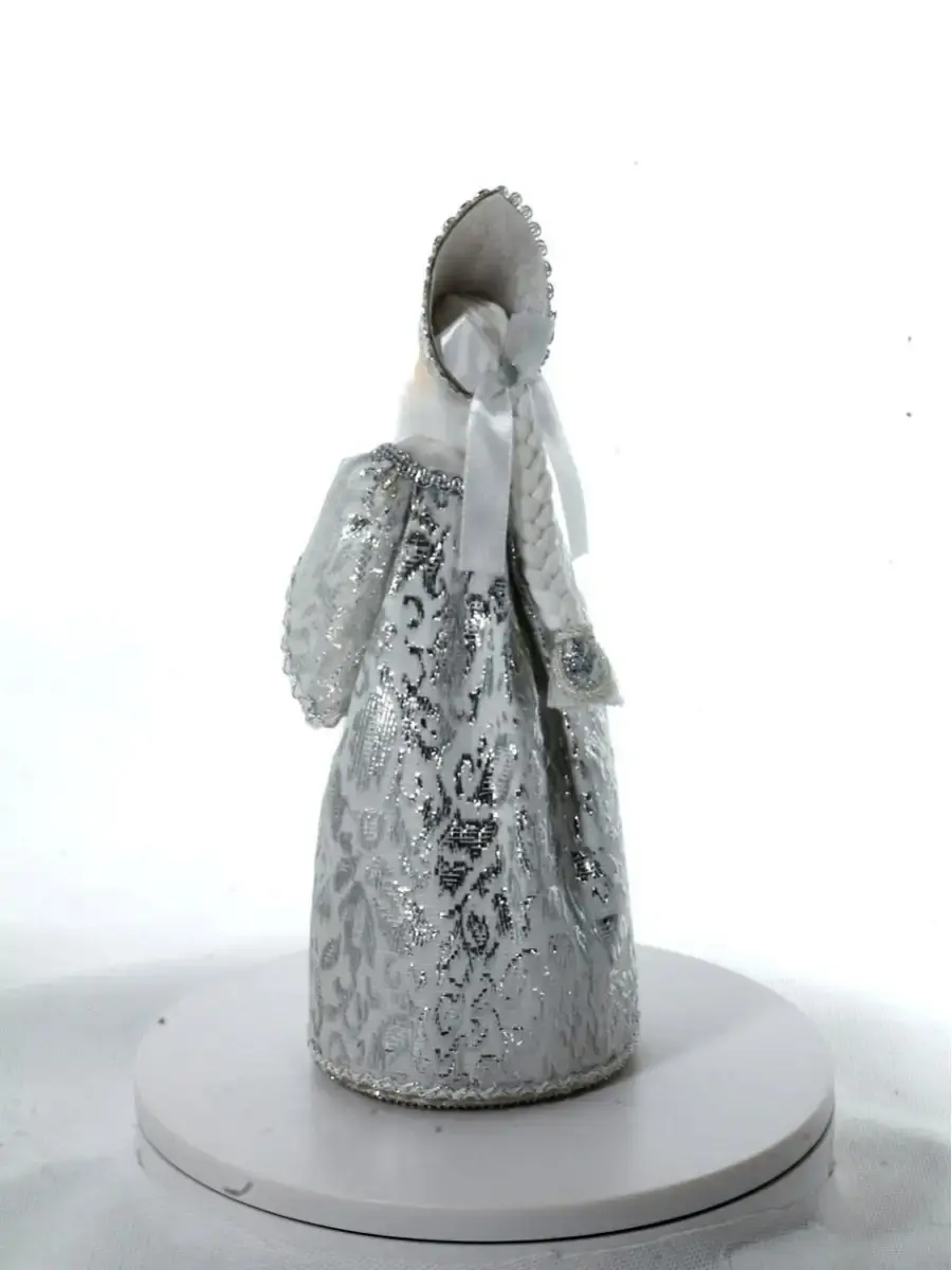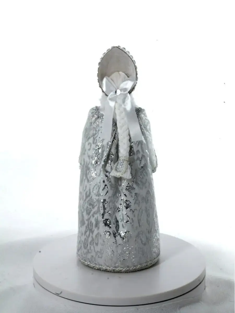 Кукла коллекционная ручной работы Снегурочка в русском костюме из серебристой парчи с меховой муфтой.