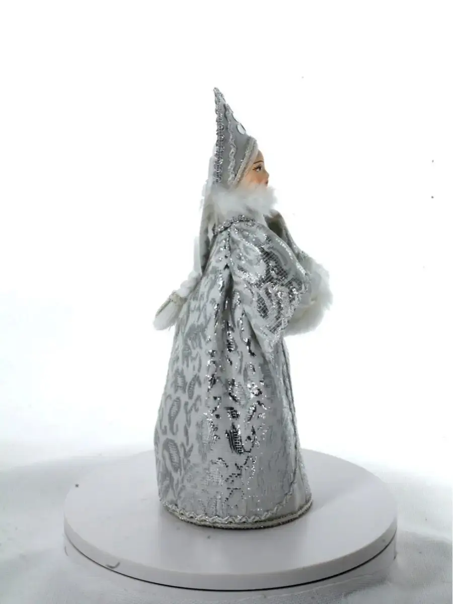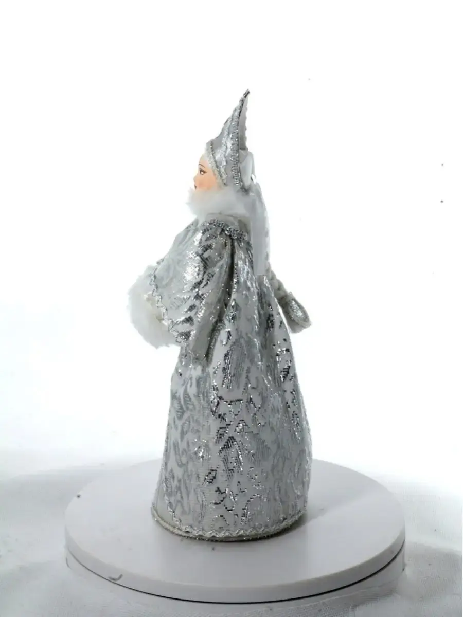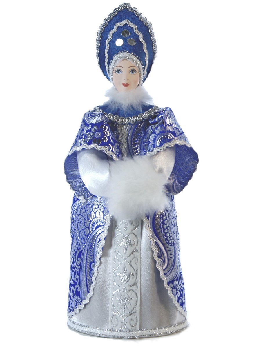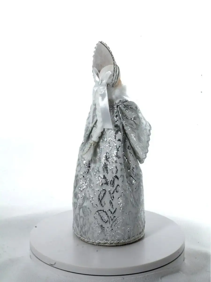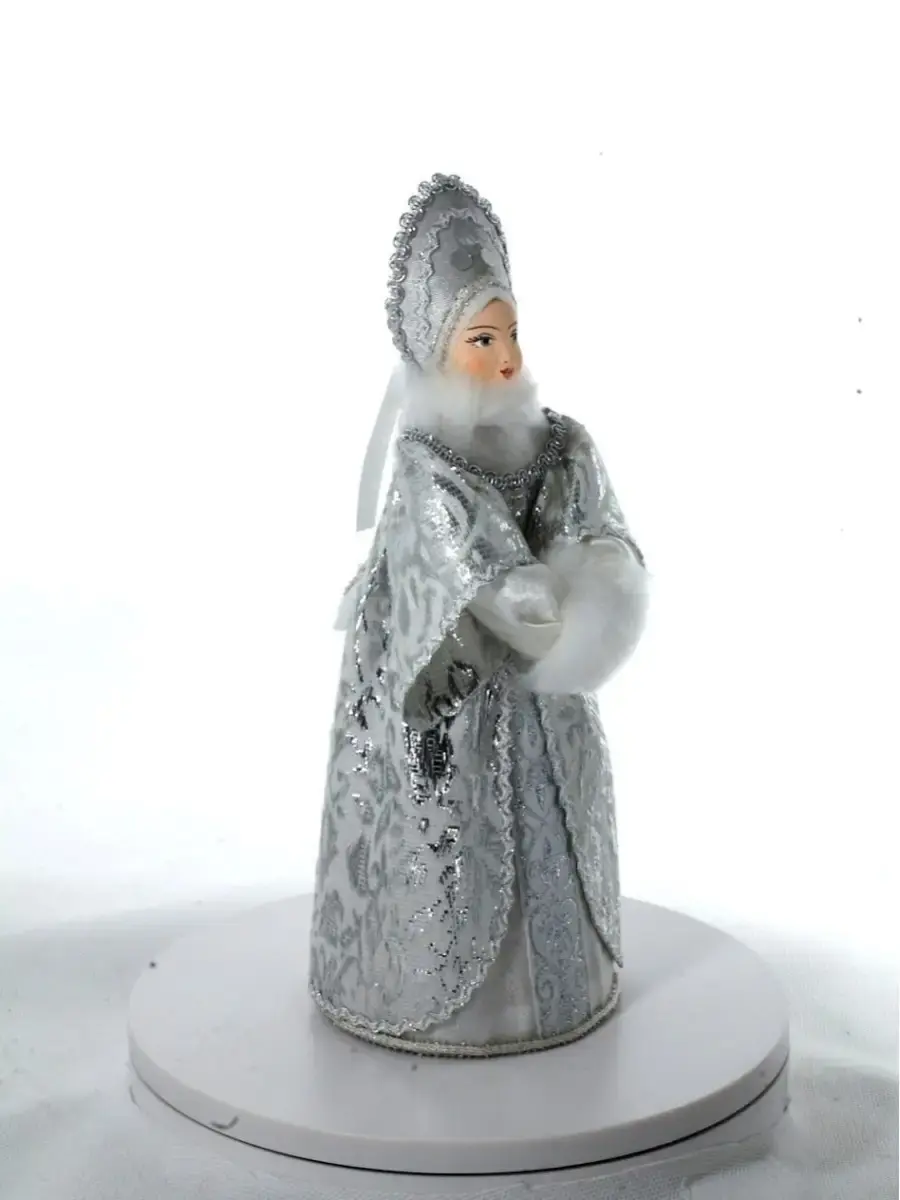 Кукла коллекционная ручной работы Снегурочка в русском костюме из серебристой парчи с меховой муфтой.